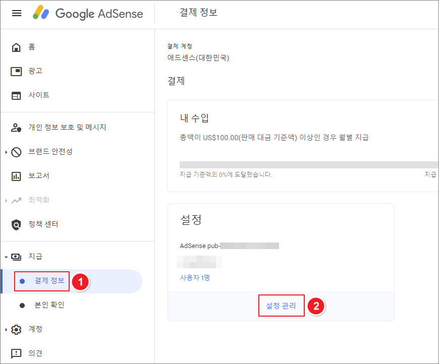 1. 애드센스 – 지급 – 결제 정보 – 설정 – 설정 관리