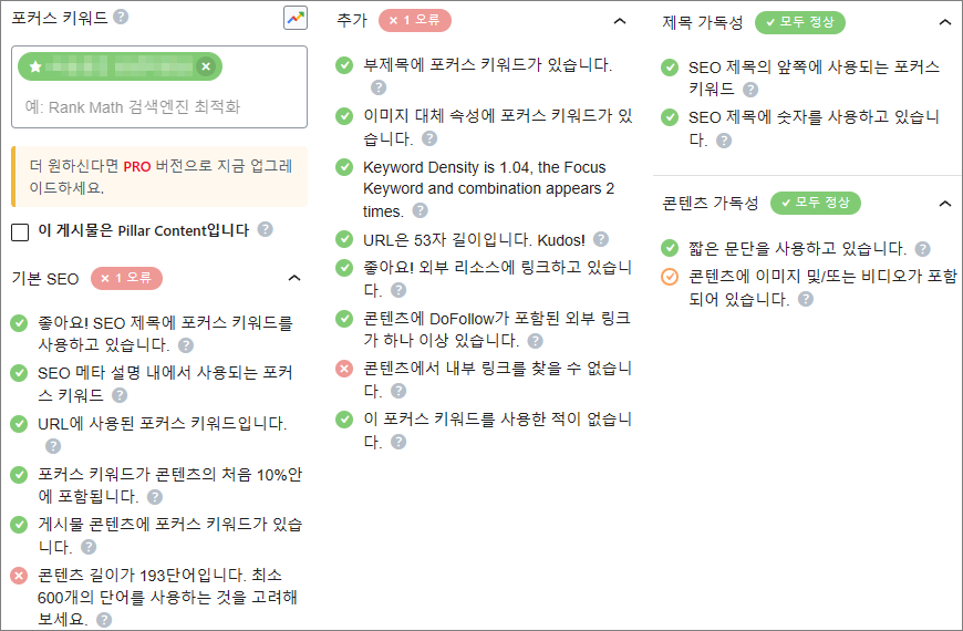 ③ 메인 키워드 + 서브 키워드를 붙여서 사용하면 메인 키워드의 상세 키워드가 된다. Rank Math의 경우 포커스 키워드라 할 수 있다.