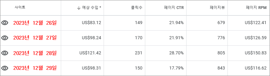 이렇게 짧은 글을 작성하고 25일까지 아무런 변화가 없다가 26일 갑자기 애드센스 수익이 빠르게 상승하게 되었다. 아마도 26일에 네이버 상위 노출이 된 것 같다. 글을 작성한 지 무려 10일이 지나서 상위 노출이 된 것이다.