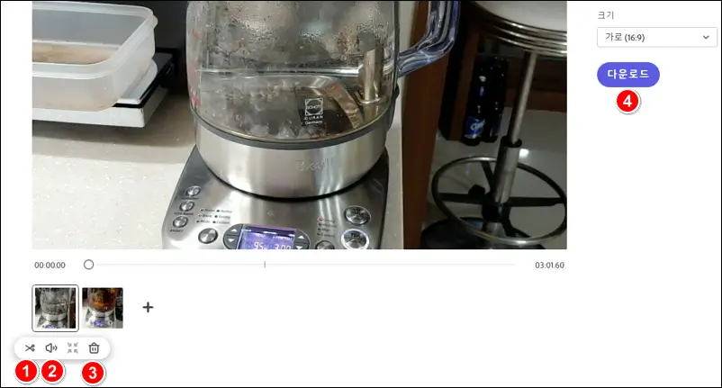 4. 하단에서 간단한 편집이 가능하다. 편집 후 ④ 다운로드하면 된다.
