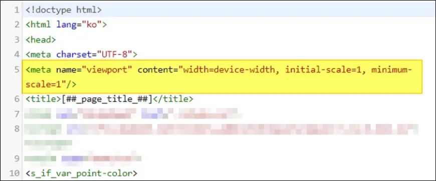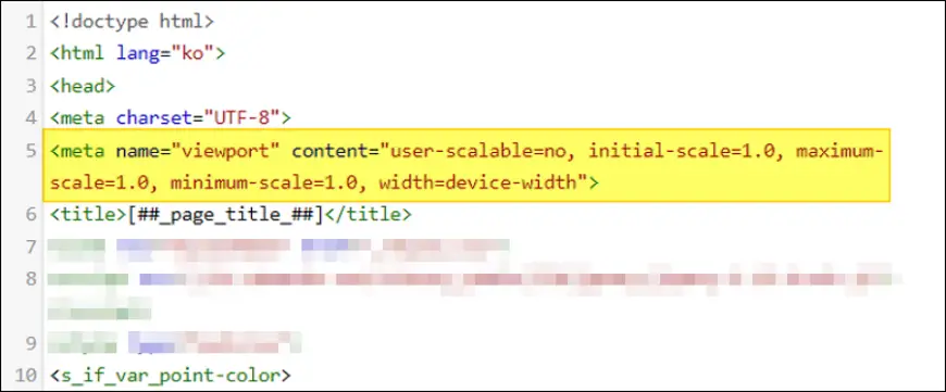 상단의 head 태그 안의 meta name=”viewport” 부분을 확인하면 아래 이미지처럼 되어 있다.