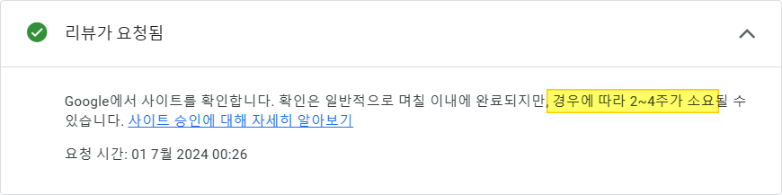 ※ 2024년 6월부터 2주였던 애드센스 검토 기간이 2 ~ 4주로 변경되었다. 앞으로 애드센스 승인은 1달은 기다려야 결과를 알 수 있다.