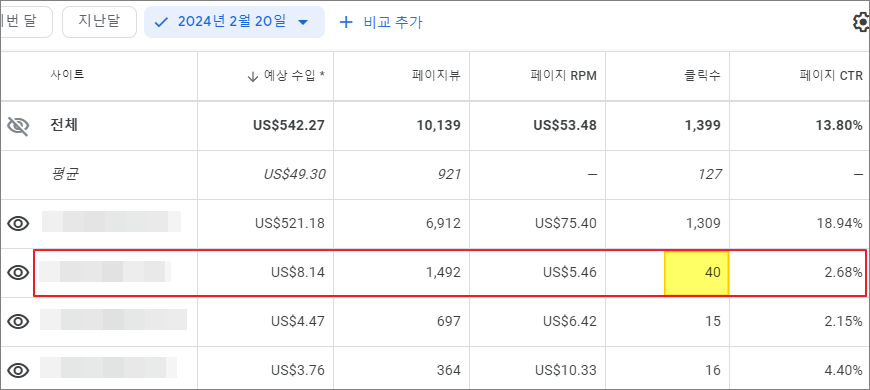 아래 이미지를 보면 2월 7일 ~ 19일까지 사이트 1개가 13일 동안 클릭수 0을 기록하고 있다. 클릭수, 페이지 CTR, CPC만 0이고, 다행히 수익이나 다른 수치는 정상이었다.