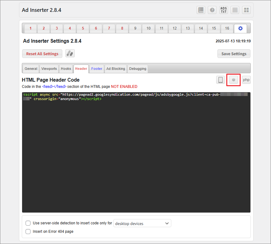 Ad Inserter 플러그인을 사용한다면 설정의 Header에서 녹색 ON 버튼을 회색으로 OFF 한다. 코드는 삭제하지 않아도 된다.