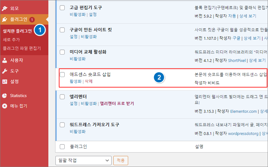 ④ 워드프레스 설정의 “플러그인 – 설치한 플러그인” 메뉴를 클릭하면 방금 업로드한 플러그인을 우측 플러그인 목록에서 찾을 수 있다. 단순하게 만든 플러그인이라 플러그인 네임, 설명, 작성자만 표시되고, 활성화, 비활성화, 삭제 메뉴만 표시된다.