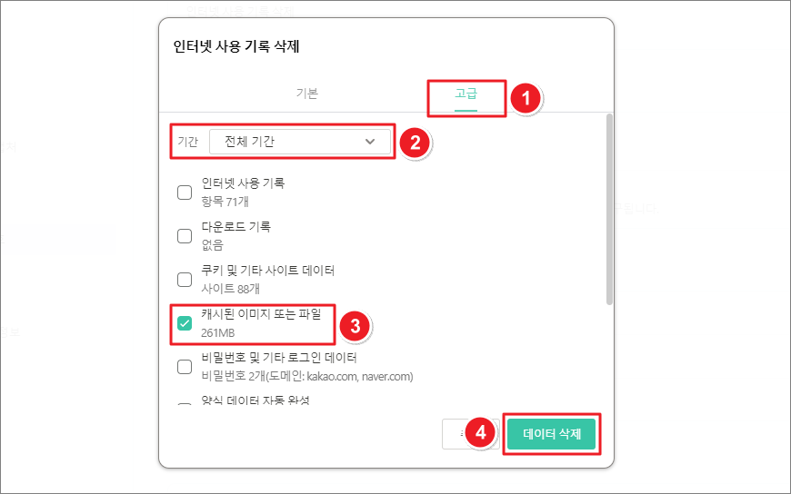 ③ 고급 탭 선택 → 기간은 전체 기간 선택 → 캐시된 이미지 및 파일 체크 → 데이터 삭제 버튼 클릭