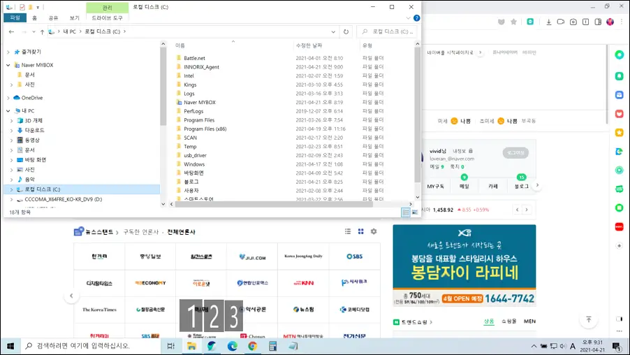 윈도우 창 크기 조절 (오른쪽, 가운데, 왼쪽) 및 멀티태스킹 실행