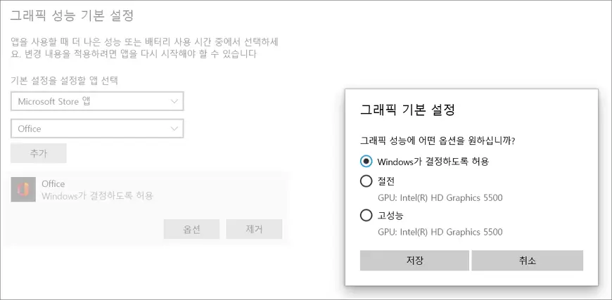 디스플레이를 선택하거나 배터리 옵션을 선택할 수 있다.