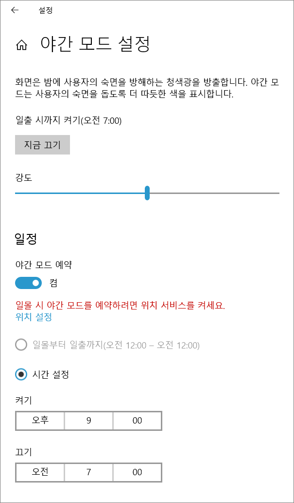 강도를 조절하거나, 야간 모드 예약 설정을 할 수 있다.