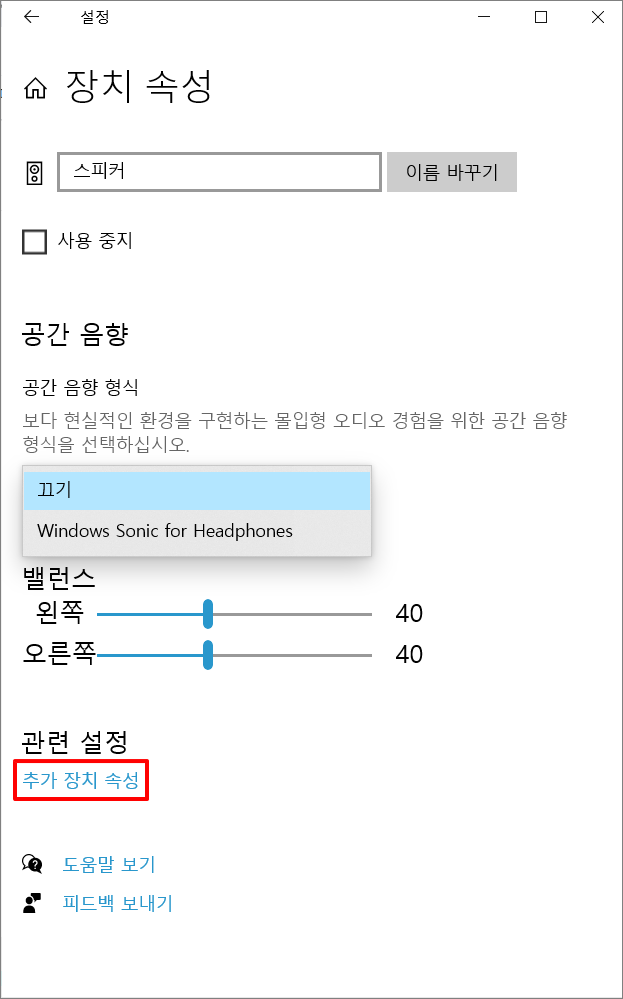 장치 속성을 표시한다. 공간 음향 설정이 가능하고, 좌우 밸런스 조절을 할 수 있다.