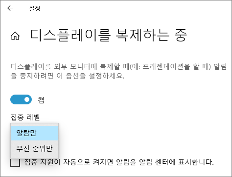 외부 모니터에 복제할 때 알림 표시 설정을 한다. (예로 파워포인트 프레젠테이션 시)