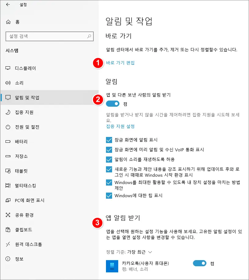 ① 알림 센터 바로 가기 편집