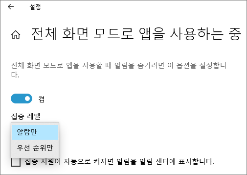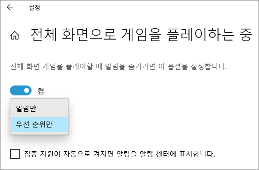 전체 화면으로 게임을 플레이할 때 알림 표시 설정을 한다.