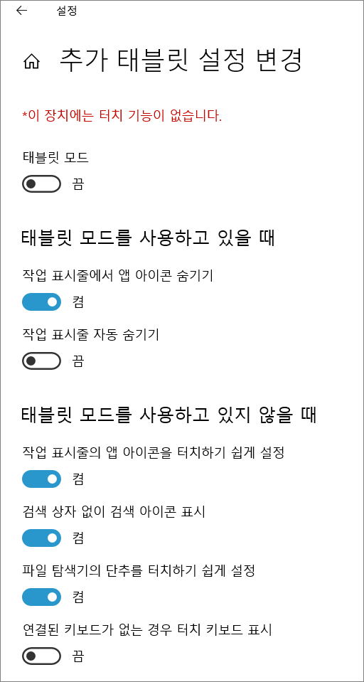 태블릿 모드 사용시 추가 설정 변경을 할 수 있다. (작업표시줄, 검색 상자, 파일 탐색기, 키보드)
