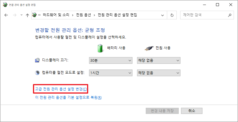 설정 변경을 클릭하면 전원 관리 옵션 설정 편집 창이 나타난다.