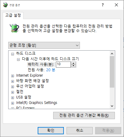 고급 전원 관리 옵션 설정 변경을 클릭하면 고급 설정을 할 수 있다.