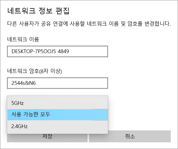 Wi-Fi 사용 시, 다른 사용자가 공유 연결에 사용할 네트워크 이름 및 암호를 변경한다.