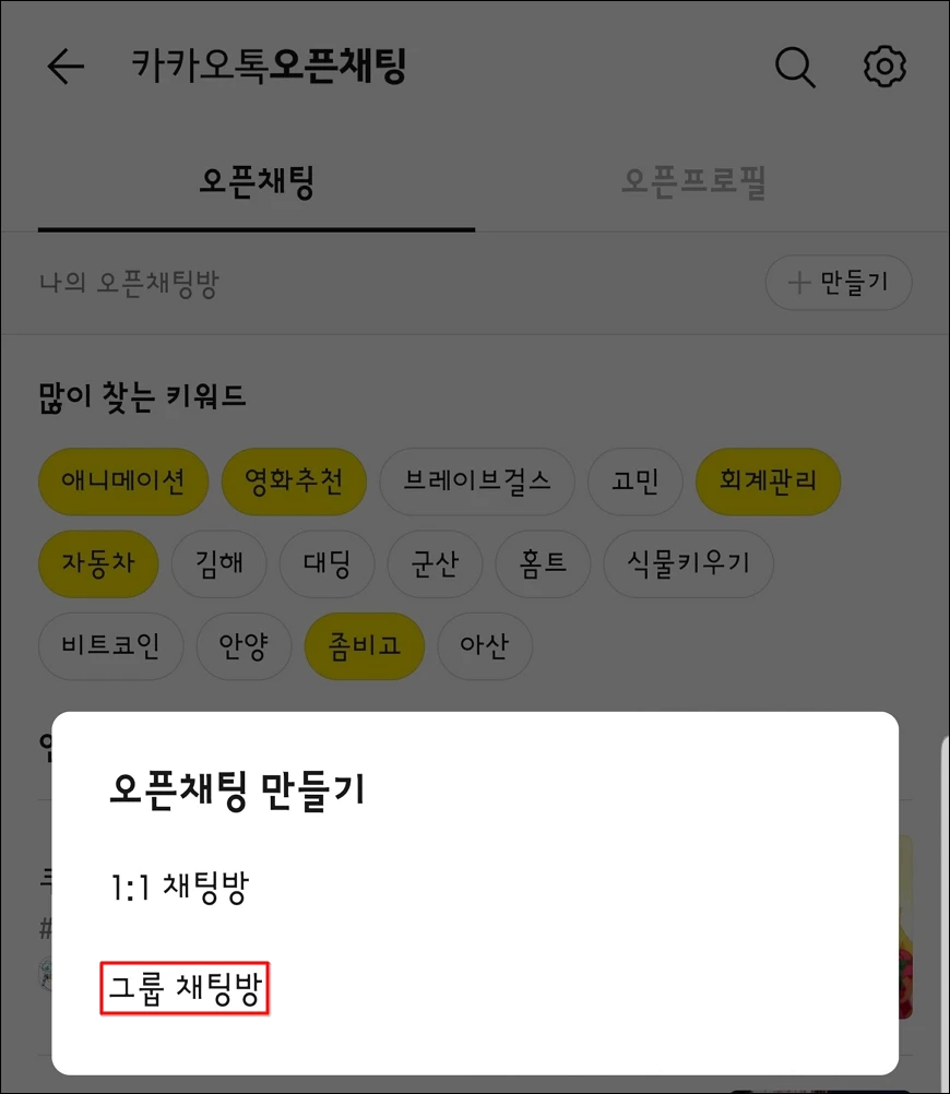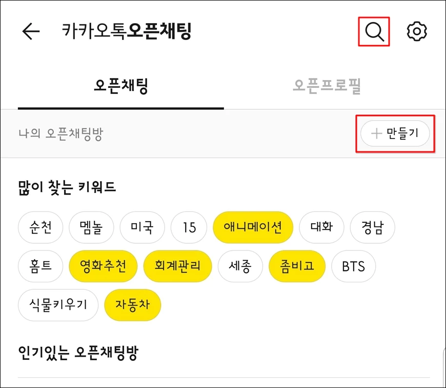 ① 오픈프로필을 만들었다면, 이제 만든 오픈프로필을 이용해서 기존 오픈채팅방에 접속하거나, 오픈채팅방을 만들면 된다. 검색하여 오픈채팅방에 들어가거나, 직접 만들어서 오픈채팅방을 운영하면 된다.