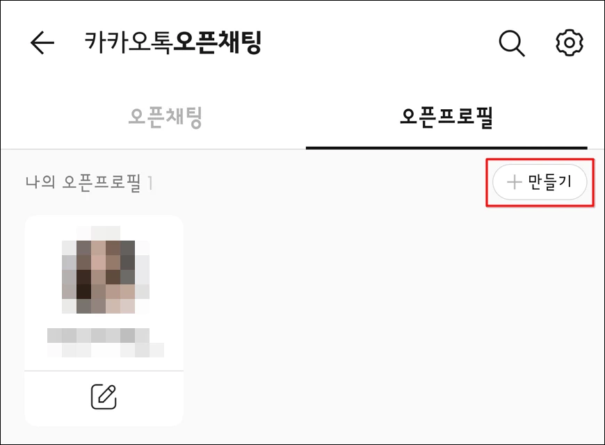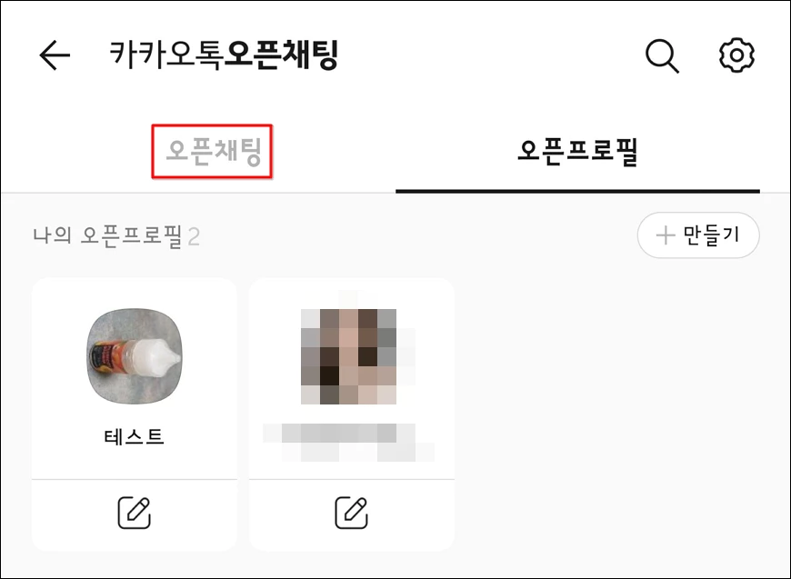 ③ 카카오톡 오픈채팅에 접속된다. 오픈프로필을 만든다. 현재 난 하나 만들어 놓은게 있다. 없다면 +만들기를 선택한다.