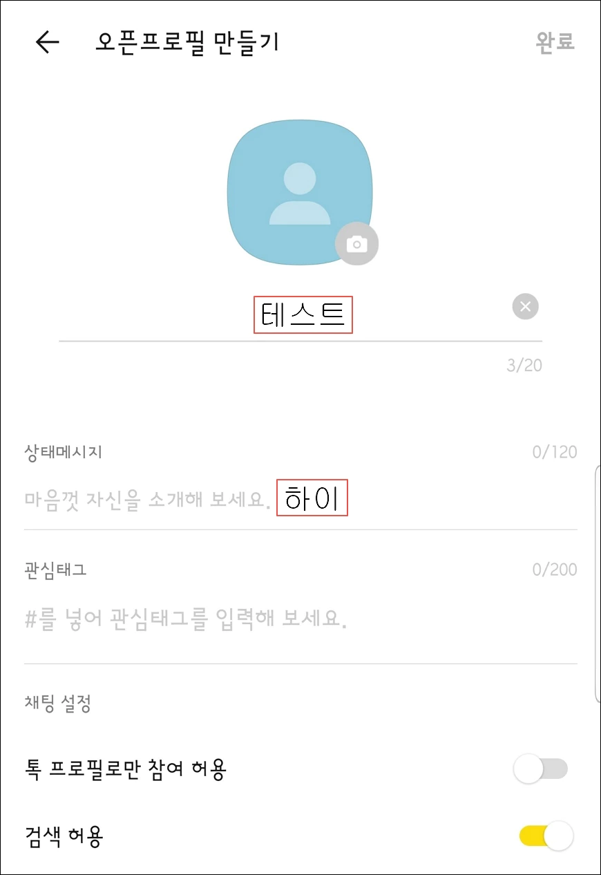 ④ 프로필 사진을 등록하고, 상태메세지 입력하고 완료 누른다. 관심태그는 넣어도되고, 안넣어도 된다.