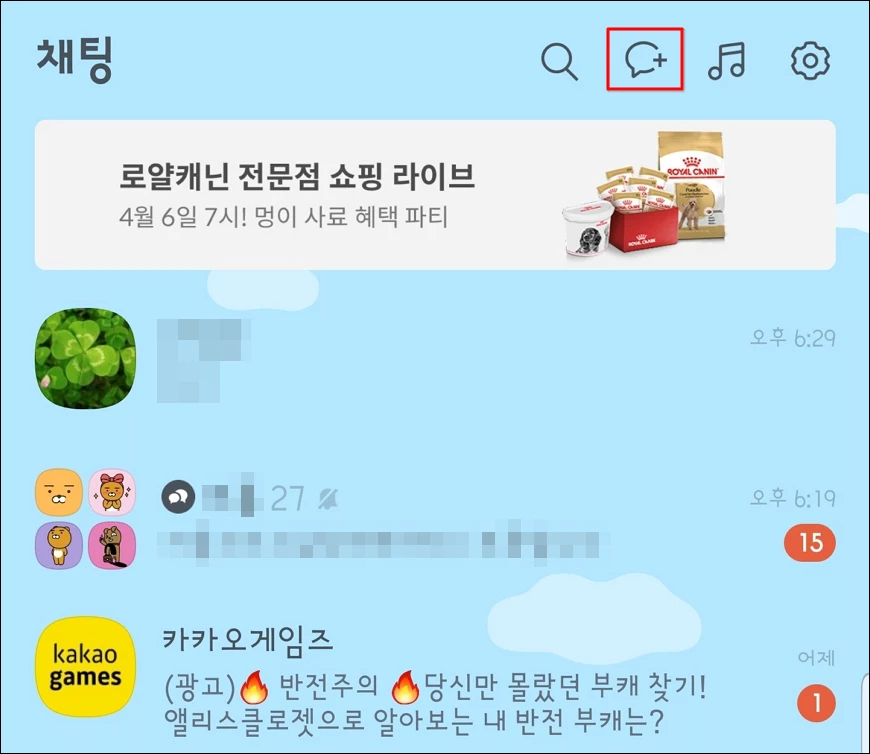① 카카오톡을 실행하고 채팅으로 들어간다. 그럼 아래와 같은 화면이 보인다. 윗쪽 말풍선 같은 그림을 선택한다.