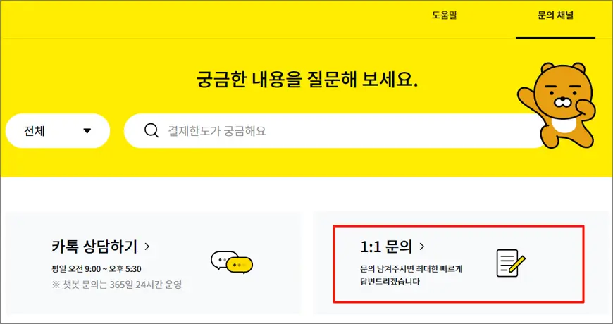 ① 카카오페이 고객센터 접속 → 문의 채널 접속 → 1:1 문의 선택