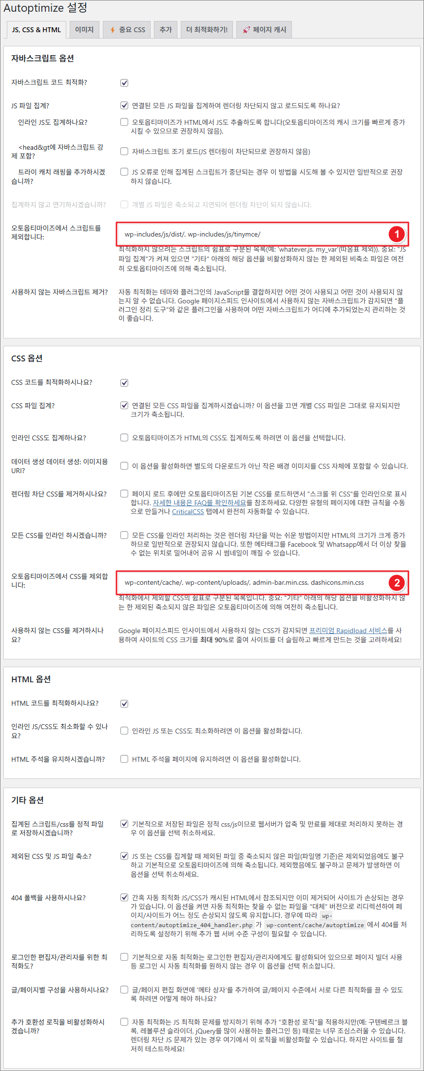 ① 본인 테마에 맞게 수정해야 한다. Autoptimize 설정 후 본인 후 사이트를 테스트 해보고, 정상적으로 동작을 안하거나 깨지는 부분이 있다면 이 부분을 추가 해야 한다. (보통 홈페이지 다양한 기능 관련)