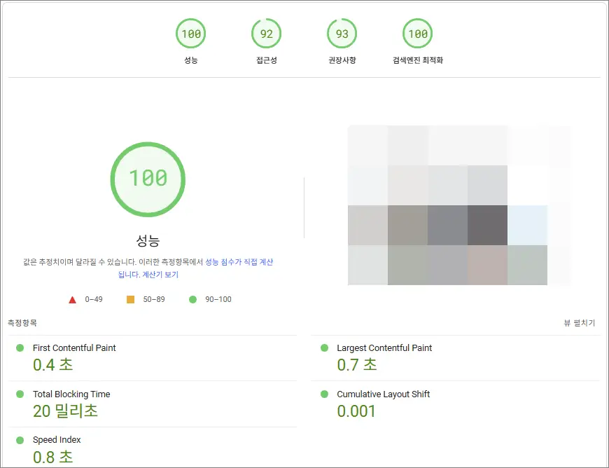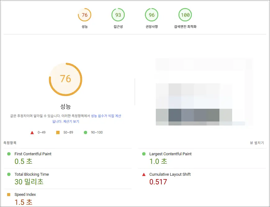 PageSpeed Insights 다시 측정한 결과 휴대전화의 경우 주황색이지만 그래도 월등한 향상을 보여줬다. 성능 부분을 90점대로 올리기 위한 가장 쉬운 방법은 섬네일을 제거하는 것이다. 이 부분은 제거할지 아니면 다른 방법을 찾아볼지 조금 더 고민해봐야겠다.