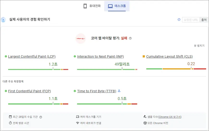 페이지스피드 인사이트 (PageSpeed Insight)에 접속해서 확인을 해보니 코어 웹 바이탈 평가 실패가 뜬다. 총 5가지 항목 중 CLS 불량이다. 위 세 가지 항목이 코어 웹 바이탈 항목이고, 아래 두 가지는 다른 주요 측정항목이다.