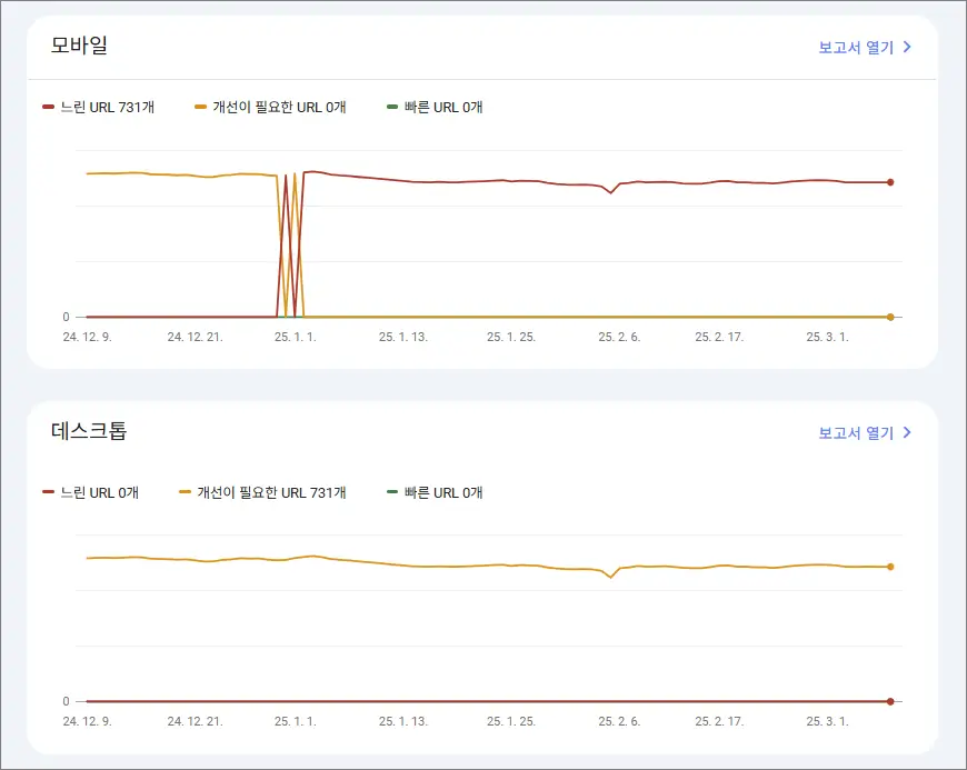 구글 서치 콘솔에서 코어 웹 바이탈을 확인해보니 모바일에서 느린 URL 731개, 데스크톱에선 개선이 필요한 URL 731개가 포함되어 있었다. 혹시 이것 때문에 검색에서 순위가 뒤로 밀리지 않을까 판단하고 코어 웹 바이탈 점수를 올려야겠다고 판단했다.