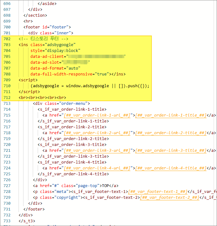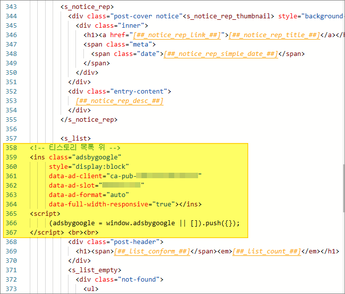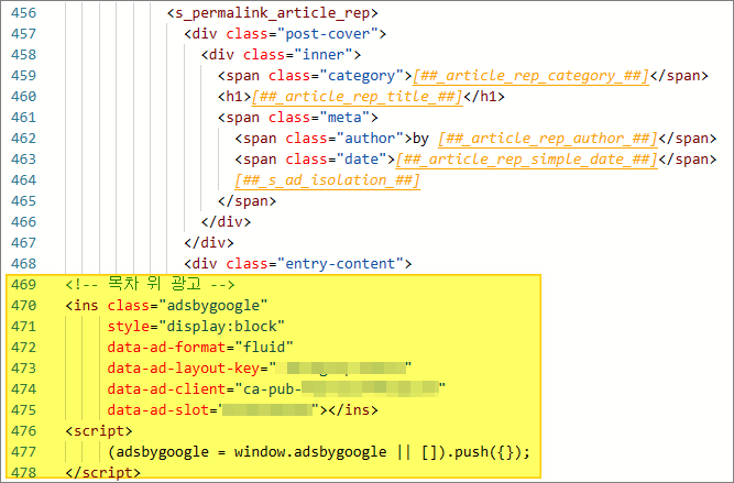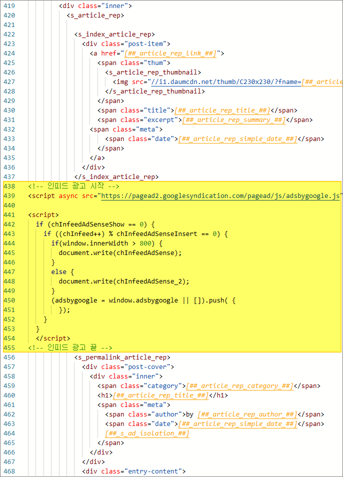 아래 이미지의 위치에 본인이 사용할 광고 코드를 넣어주면 된다. (저 같은 경우 일부러 큰 광고를 넣을려고 인피드 광고를 넣었습니다.)