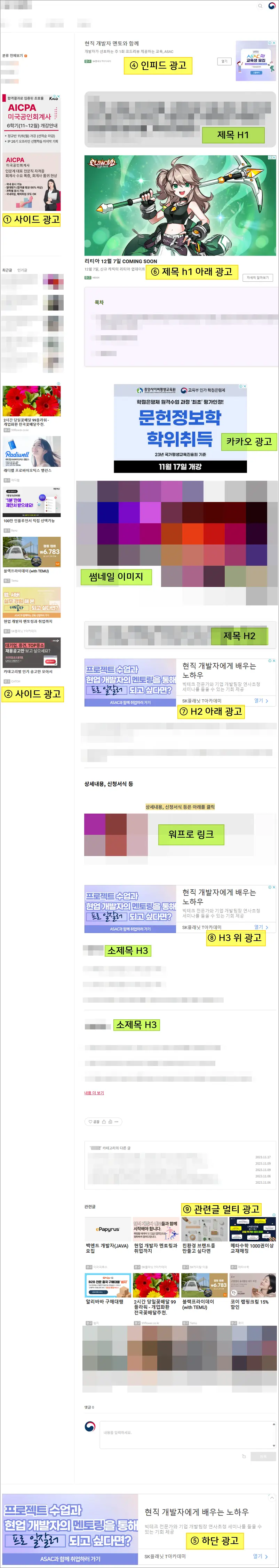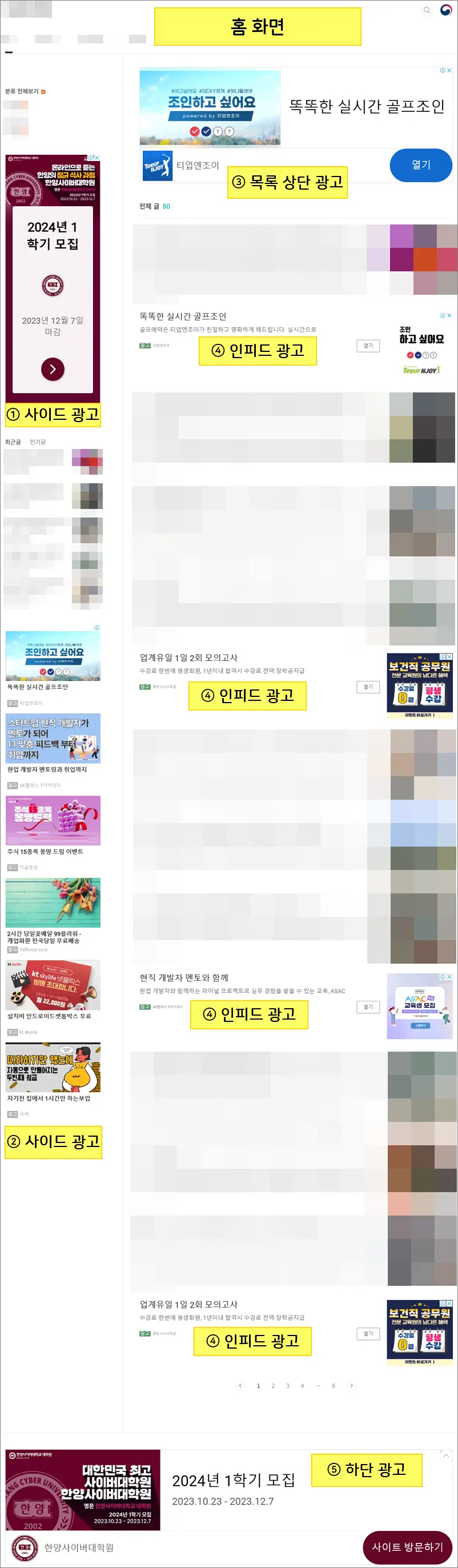광고는 사이드바에 2개, 목록 상단에 1개, 목록 중간에 4개, 하단에 1개가 들어간다. 정확한 위치는 아래 이미지에 표시했다.