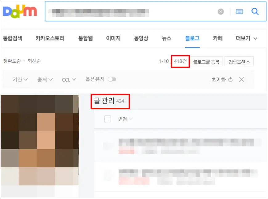 위 이미지를 보면 전체 발행한 글은 총 424개지만 실제 다음에서 검색된 글은 총 418개다. 총 6개의 글이 다음 누락 되었다.