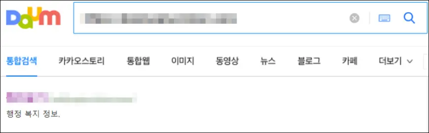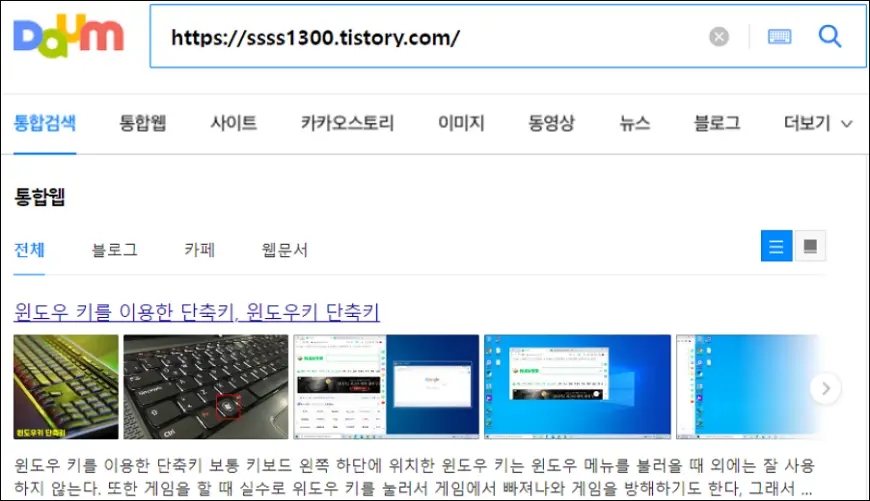 최적화된 블로그라면 다음 검색창에 자신의 티스토리 주소를 입력하면 바로 아래 사이트가 표시된다. 만약 주소 뒤에 슬래시까지 함께 입력하면 맨 아래 하단에 사이트가 표시된다.
