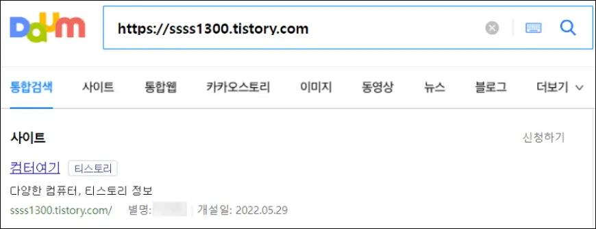 다음 검색창에 “https://티스토리 주소/”를 입력하면 사이트 이름이 화면 하단에 표시된다.