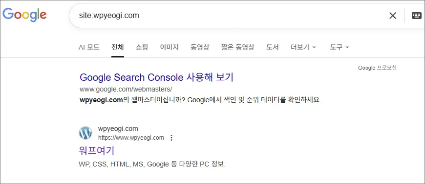 현재 weyeogi.com 도메인이 구글에 검색이 안됩니다. 아래 이미지처럼 딱 도메인 하나만 검색됩니다.
